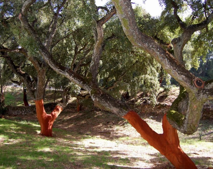 Árbol alcornoque después de la extracción de su corteza para crear el corcho. Fuente: Arquitectura Sostenible. Referencia: https://arquitectura-sostenible.es/el-corcho-un-material-sostenible-con-multiples-ventajas-para-la-construccion/