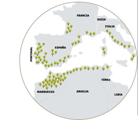 Mapa de la distribución mundial del alcornocal. Fuente: APCOR. Referencia: https://corkup.es/corcho-natural/