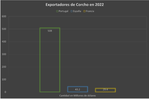 Principales países exportadores de corcho en el mundo. Fuente: Data México. Referencia: https://www.economia.gob.mx/datamexico/es/profile/product/articles-of-natural-cork#:~:text=En%20el%20contexto%20global%2C%20los,Francia%20(US%2429.4M).