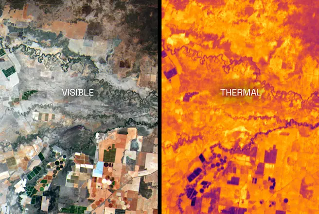 La termografía también se ha consolidado como una tecnología esencial para la vigilancia de los ecosistemas. Entre otras cosas, puede utilizarse para identificar zonas que sufren sequía (midiendo el contenido de humedad de la superficie de un suelo), zonas forestales con riesgo de incendio (detección temprana de focos de calor antes de que se conviertan en llamas visibles), vigilar la propagación de un incendio forestal (incluso con visibilidad reducida por el humo) para extinguir el fuego con la mayor eficacia posible, detectar y gestionar la actividad animal en un entorno natural por ser seres que emiten calor o medir las variaciones de temperatura a lo largo del tiempo. Por ejemplo, en 2024, la cámara de infrarrojos de ABB a bordo del satélite VanZyl-1 de Hydrosat generó con éxito imágenes para respaldar datos que ayuden a los gobiernos y al sector privado a hacer frente al estrés hídrico en la agricultura.