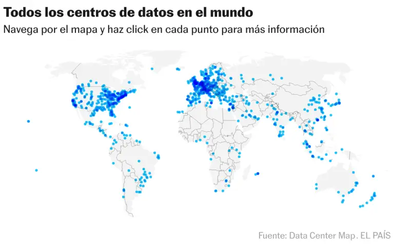 En todo el mundo, existen decenas de miles de centros de datos, desde pequeños centros regionales hasta gigantes instalaciones de empresas como Google, Amazon, Microsoft y Meta, estos son la columna vertebral de la era digital, ya que almacenan, procesan y distribuyen la información que usamos a diario en internet, aplicaciones y servicios en la nube. Estos centros se concentran principalmente en regiones con buena infraestructura, energía económica y clima favorable, como EE. UU., Europa del Norte y Asia. Se ubican en regiones donde no solo hay buena infraestructura y energía económica, sino también disponibilidad hídrica, lo cual puede generar tensiones en zonas donde el agua es escasa o está en disputa.
